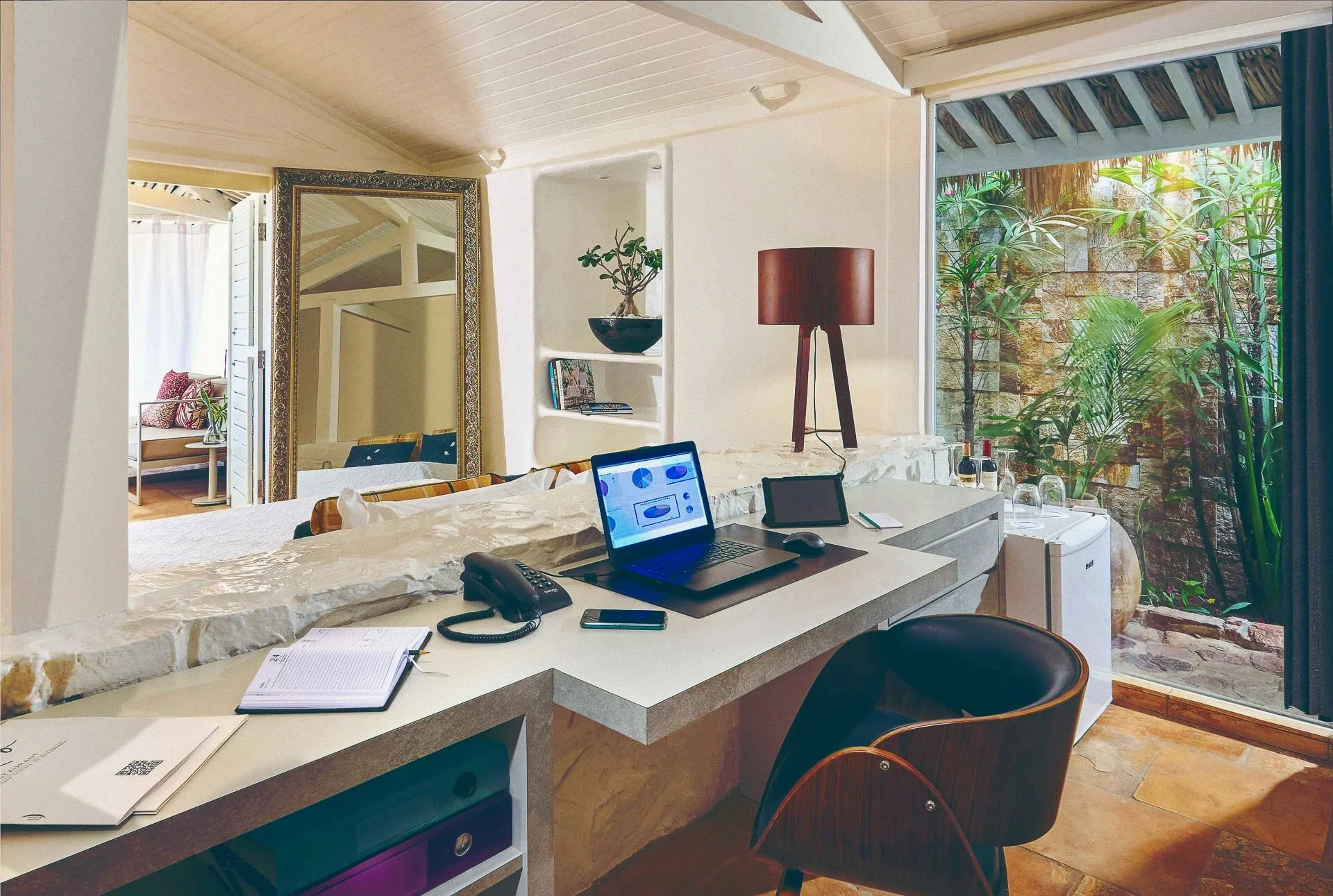 Thanks to our large private spaces, lounges and gardens to relax, exercise and live without interference of any other person, our complimentary high-speed optical fiber internet access for efficient connection to the outside business world, our private office space in most rooms for whom wants to work from their own private room, lounge or garden, or somewhere in our tropical park in total safety and serenity.